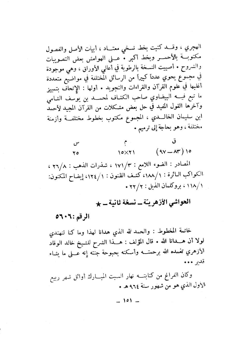 (ق 15 (83 - 97) / م 21* 15/ س 25) المصادر: الضوء اللامع: 3/ 171، شذرات الذهب: 8/ 26، الكواكب البائرة: 1/ 188، كشف الظنون: 1/ 124، إيضاح المكنون: