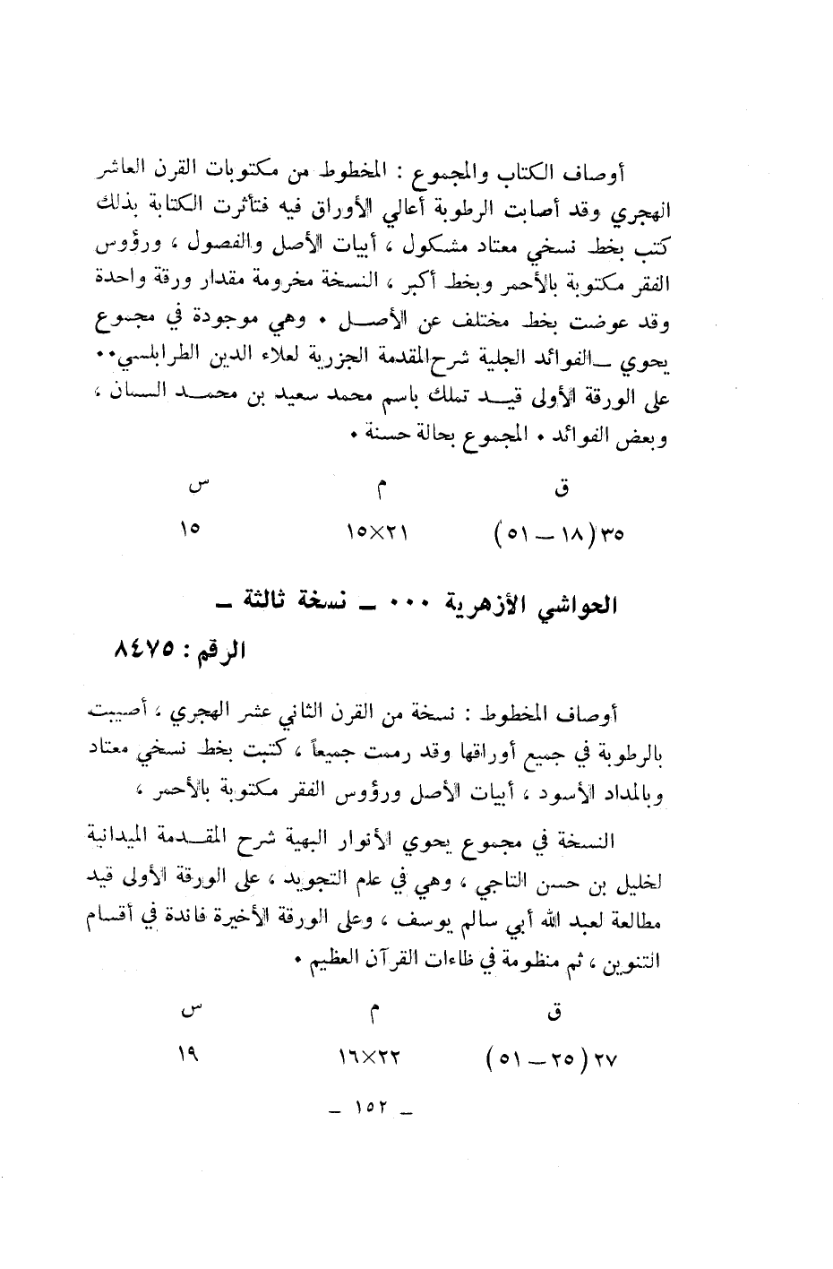 أوصاف المخطوط: نسخة من القرن الثاني عشر الهجري، أصيبت بالرطوبة في جميع أوراقها وقد رممت جميعا، كتبت بخط نسخي معتاد وبالمداد الأسود، أبيات الأصل ورءوس الفقر مكتوبة بالأحمر، النسخة في مجموع يحوي الأنوار البهية شرح المقدمة الميدانية لخليل بن حسن التاجي، وهي في عام التجويد، على الورقة الأولى قيد مطالعة لعبد الله أبي سالم يوسف، وعلى الورقة الأخيرة فائدة في أقسام التنوين، ثم منظومة في ظاءات القرآن العظيم.