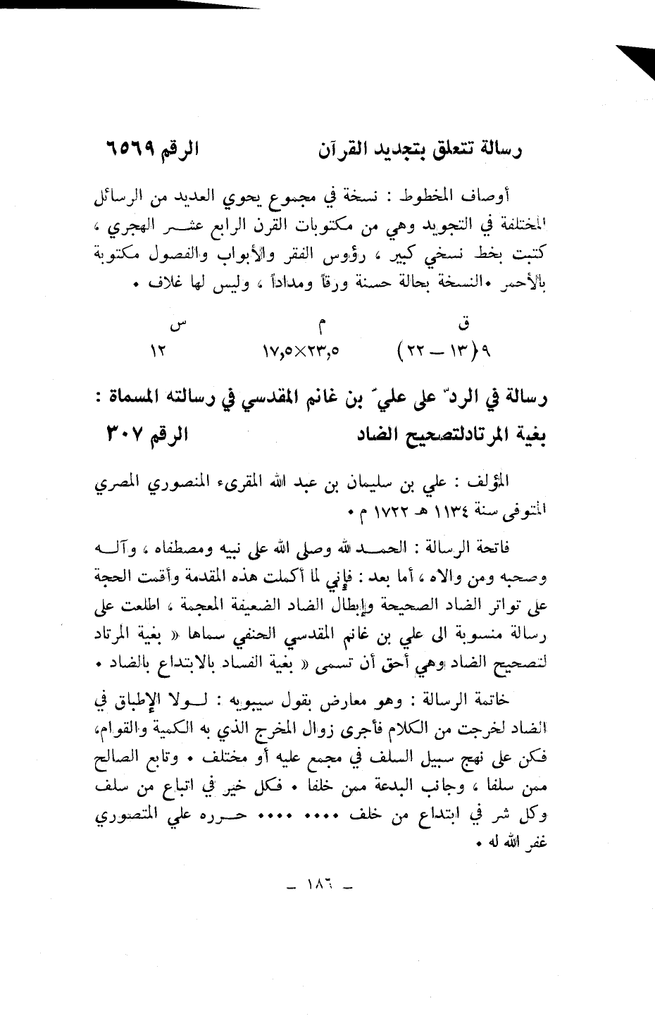 رسالة في الردّ على عليّ بن غانم المقدسي في رسالته المسماة: بغية المرتاد لتصحيح الضاد الرقم 307