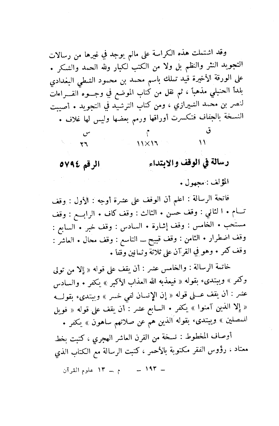 رسالة في الوقف والابتداء الرقم 5794