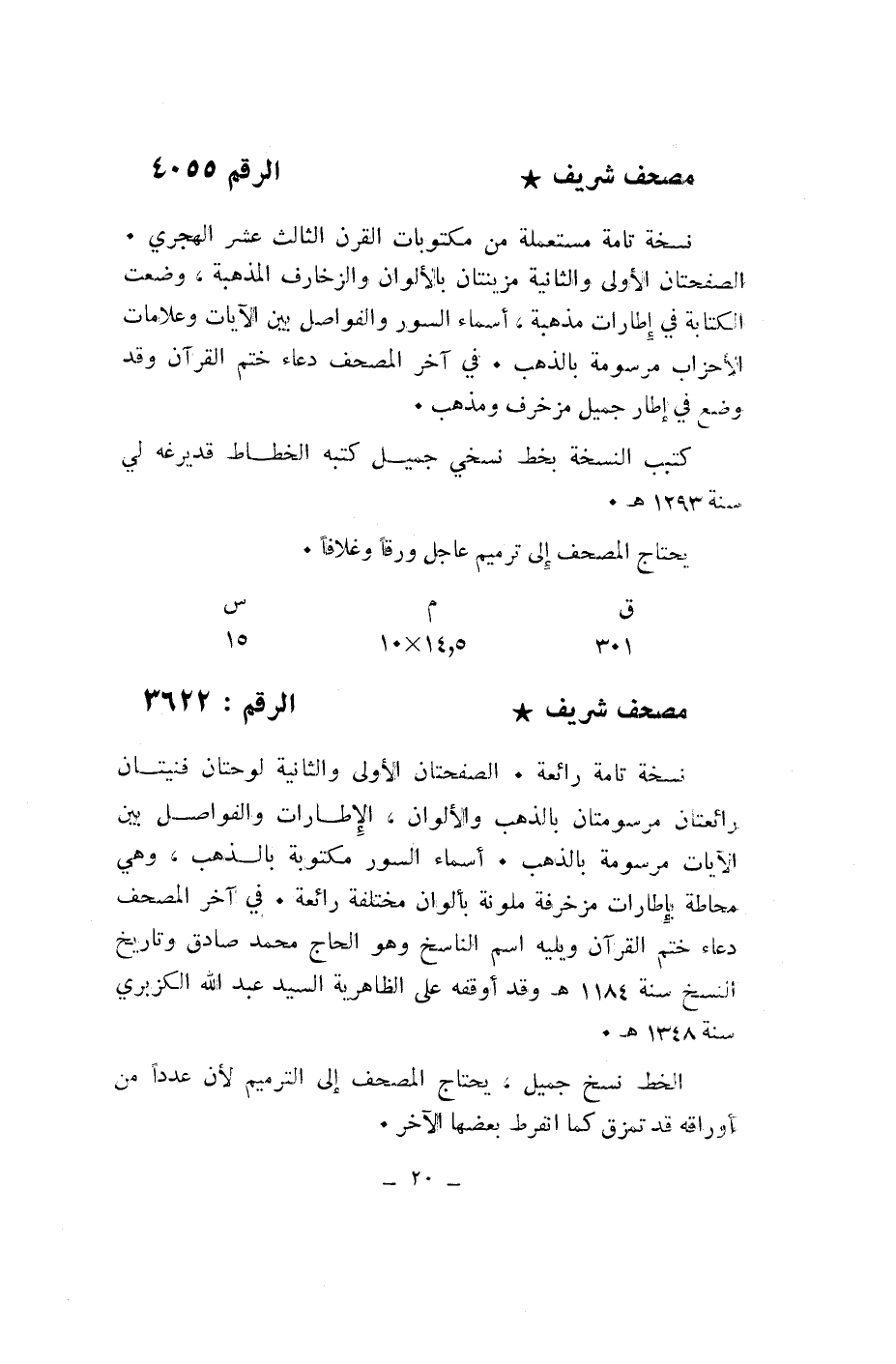 نسخة تامة رائعة. الصفحتان الأولى والثانية لوحتان فنيتان رائعتان مرسومتان بالذهب والألوان، الإطارات والفواصل بين الآيات مرسومة بالذهب. أسماء السور مكتوبة بالذهب، وهي محاطة بإطارات مزخرفة ملونة بألوان مختلفة رائعة. في آخر المصحف دعاء ختم القرآن ويليه اسم الناسخ وهو الحاج محمد صادق وتاريخ النسخ سنة 1184 هـ وقد أوقفه على الظاهرية السيد عبد الله الكزبري سنة 1348 هـ.