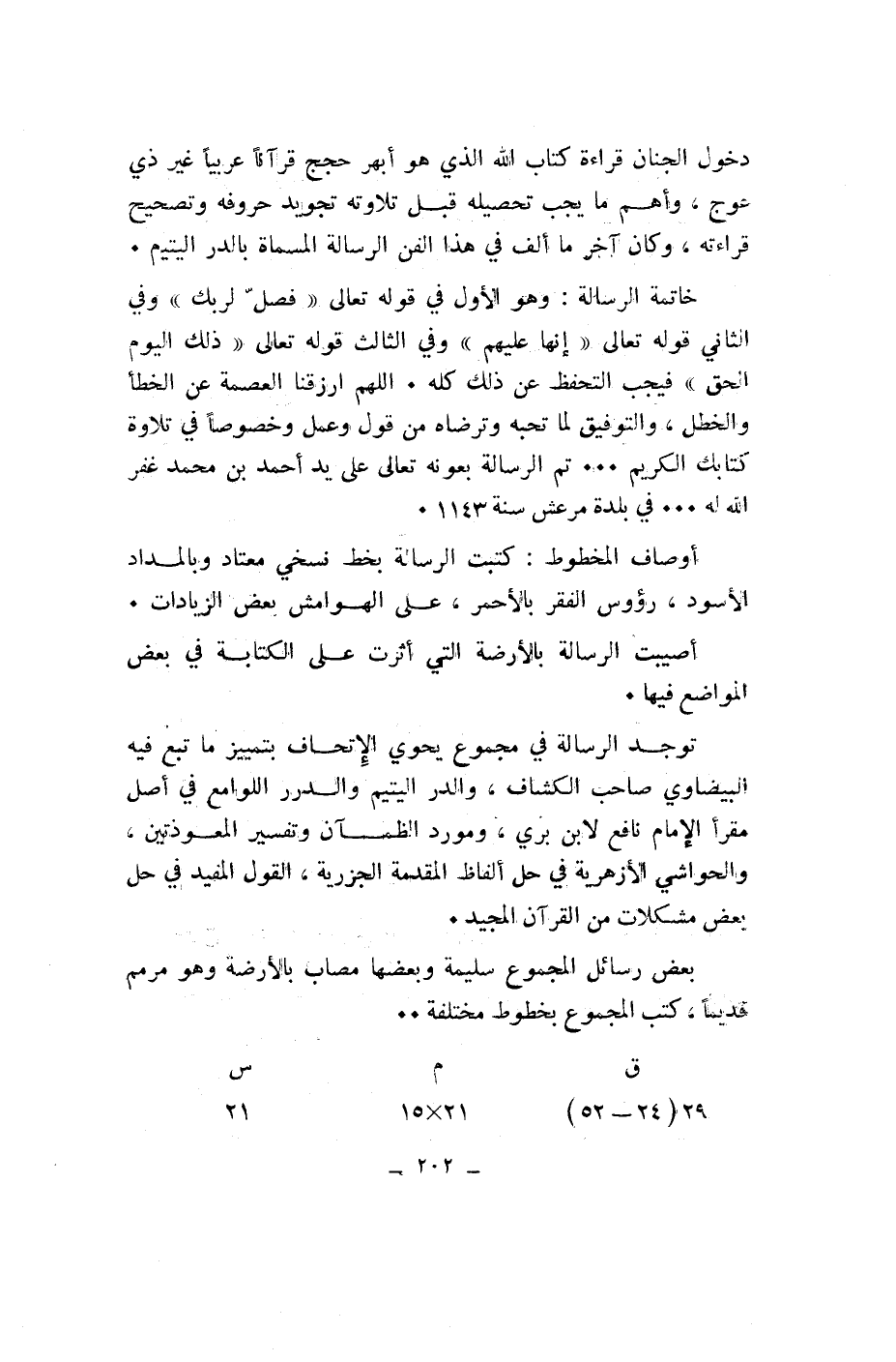 خاتمة الرسالة: وهو الأول في قوله تعالى «فصلّ لربك» وفي الثاني قوله تعالى «إِنَّها عَلَيْهِمْ» وفي الثالث قوله تعالى «ذلِكَ الْيَوْمُ الْحَقُّ» فيجب التحفظ عن ذلك كله. اللهم ارزقنا العصمة عن الخطأ والخطل، والتوفيق لما تحبه وترضاه من قول وعمل وخصوصا في تلاوة كتابك الكريم ... تم الرسالة بعونه تعالى على يد أحمد بن محمد غفر الله له ... في بلدة مرعش سنة 1143.
