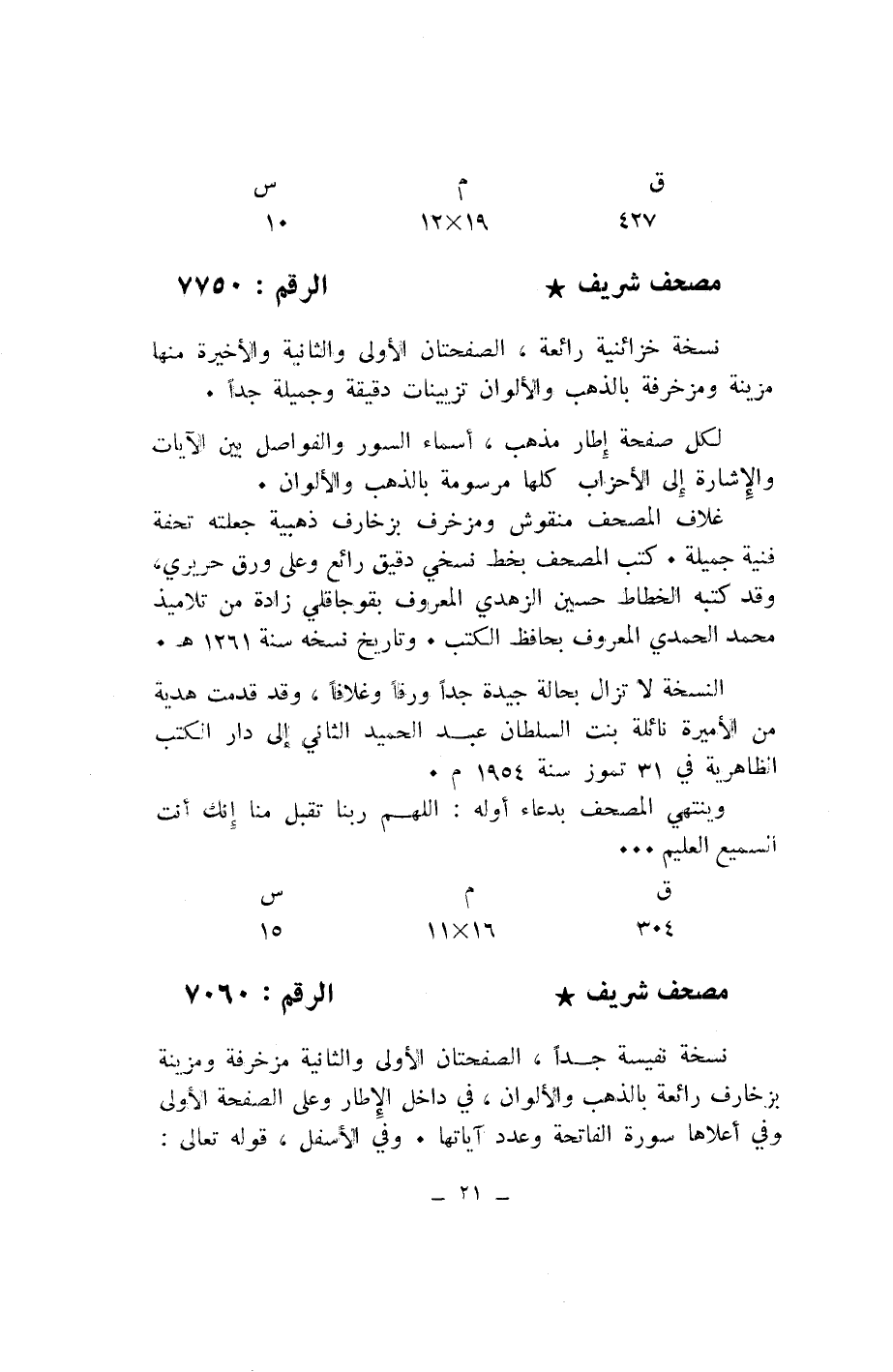 نسخة نفيسة جدا، الصفحتان الأولى والثانية مزخرفة ومزينة بزخارف رائعة بالذهب والألوان، في داخل الإطار وعلى الصفحة الأولى وفي أعلاها سورة الفاتحة وعدد آياتها. وفي الأسفل، قوله تعالى: