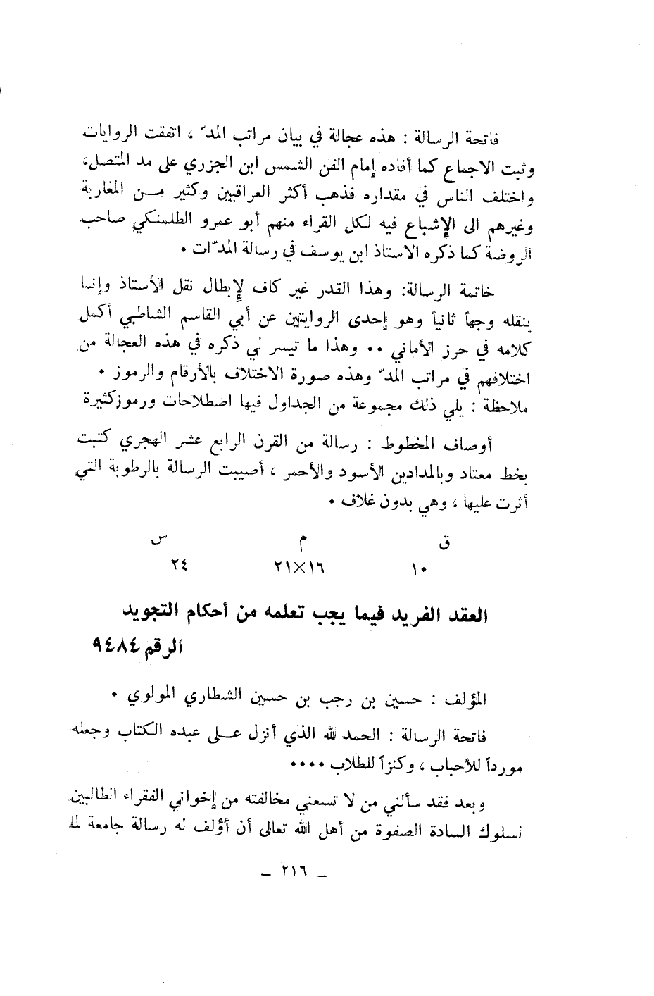ملاحظة: يلي ذلك مجموعة من الجداول فيها اصطلاحات ورموز كثيرة أوصاف المخطوط: رسالة من القرن الرابع عشر الهجري كتبت بخط معتاد وبالمدادين الأسود والأحمر، أصيبت الرسالة بالرطوبة التي أثرت عليها، وهي بدون غلاف.