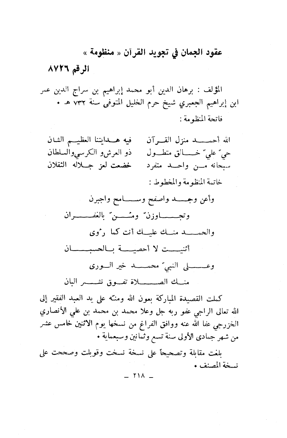 عقود الجمان في تجويد القرآن «منظومة» الرقم 8726