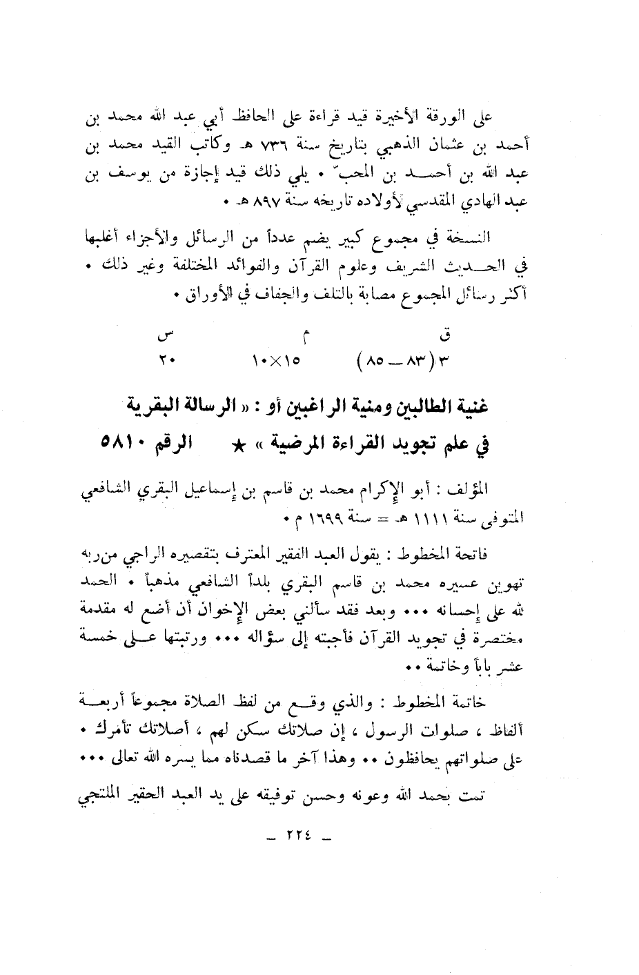 غنية الطالبين ومنية الراغبين أو: «الرسالة البقرية في علم تجويد القراءة المرضية» * الرقم 5810