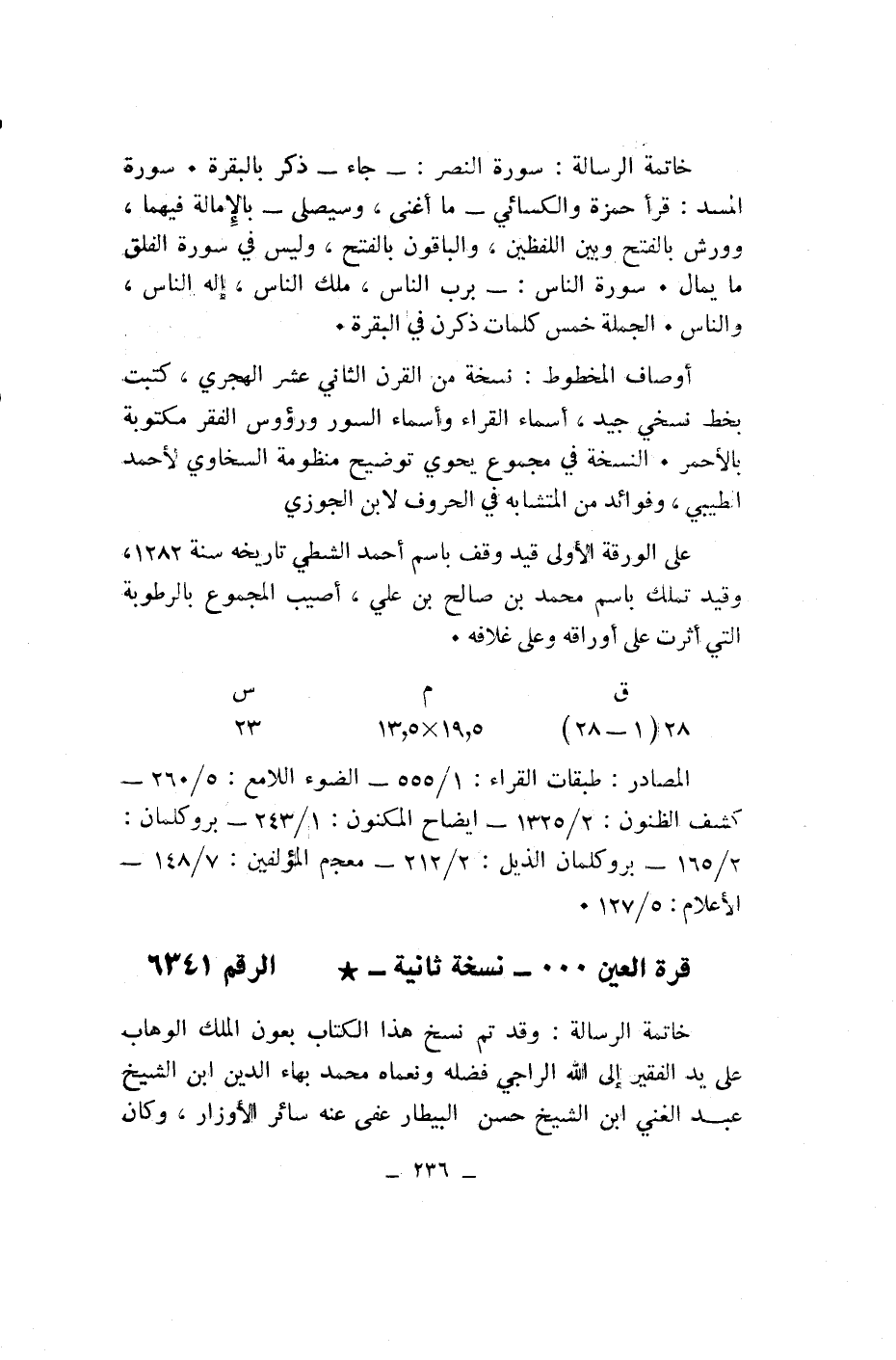 أوصاف المخطوط: نسخة من القرن الثاني عشر الهجري، كتبت بخط نسخي جيد، أسماء القراء وأسماء السور ورءوس الفقر مكتوبة بالأحمر. النسخة في مجموع يحوي توضيح منظومة السخاوي لأحمد الطيبي، وفوائد من المتشابه في الحروف لابن الجوزي على الورقة الأولى قيد وقف باسم أحمد الشطي تاريخه سنة 1282، وقيد تملك باسم محمد بن صالح بن علي، أصيب المجموع بالرطوبة التي أثرت على أوراقه وعلى غلافه.