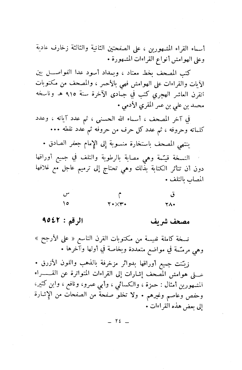 في آخر المصحف، أسماء الله الحسنى، ثم عدد آياته، وعدد كلماته وحروفه، ثم عدد كل حرف من حروفه ثم عدد نقطه ...