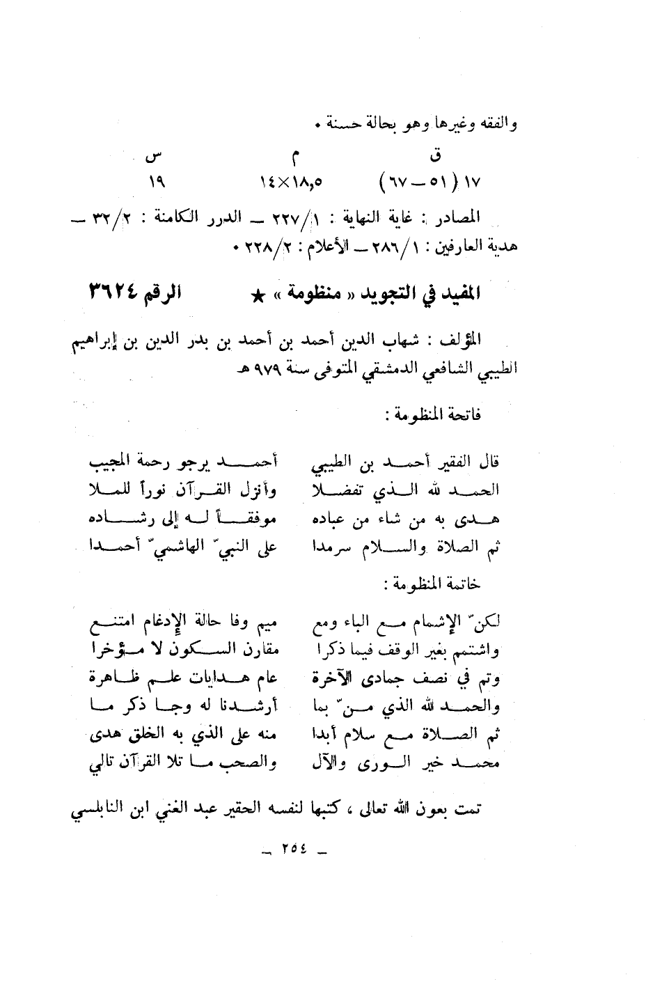المؤلف: شهاب الدين أحمد بن أحمد بن بدر الدين بن إبراهيم الطيبي الشافعي الدمشقي المتوفى سنة 979 هـ فاتحة المنظومة: