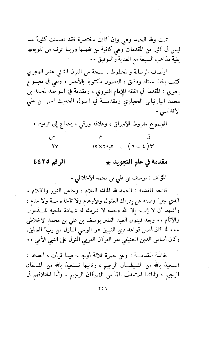 الذي جلّ وصفه عن إدراك العقول والأوهام ولا تأخذه سنة ولا منام، وأشهد أن لا إله إلا الله وحده لا شريك له شهادة ماحية للذنوب والآثام .. وبعد فيقول العبد الفقير يوسف بن علي بن محمد الأخلاطي ... لما كان أصل قواعد دين النبيين هو الوحي النازل من ربّ العالمين، وكان أساس الدين الحنيفي هو القرآن العربي المنزل على النبي الأمي ..