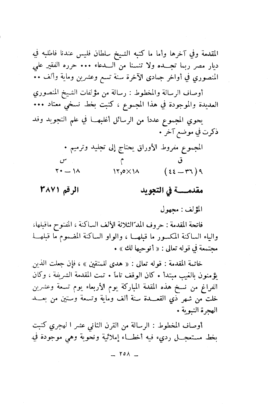 المقدمة وفي آخرها وأما ما كتبه الشيخ سلطان فليس عندنا فاطلبه في ديار مصر ربما تجده ولا تنسنا من الدعاء ... حرره الفقير علي المنصوري في أواخر جمادى الآخرة سنة تسع وعشرين ومائة وألف ..