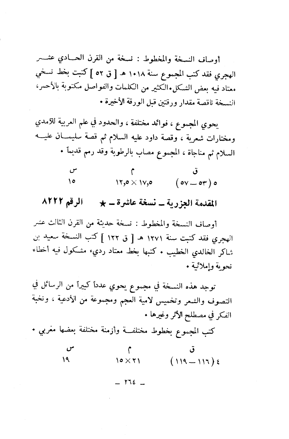 أوصاف النسخة والمخطوط: نسخة حديثة من القرن الثالث عشر الهجري فقد كتبت سنة 1271 هـ[ق 122] كتب النسخة سعيد بن شاكر الخالدي الخطيب. كتبها بخط معتاد رديء مشكول فيه أخطاء نحوية وإملائية.