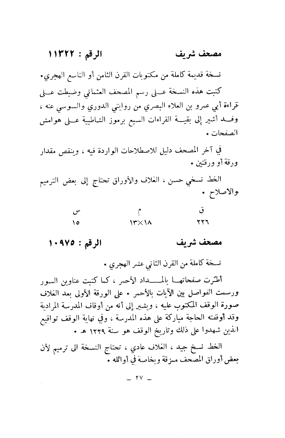 الخط نسخ جيد، الغلاف عادي، تحتاج النسخة الى ترميم لأن بعض أوراق المصحف ممزقة وبخاصة في أوائله.