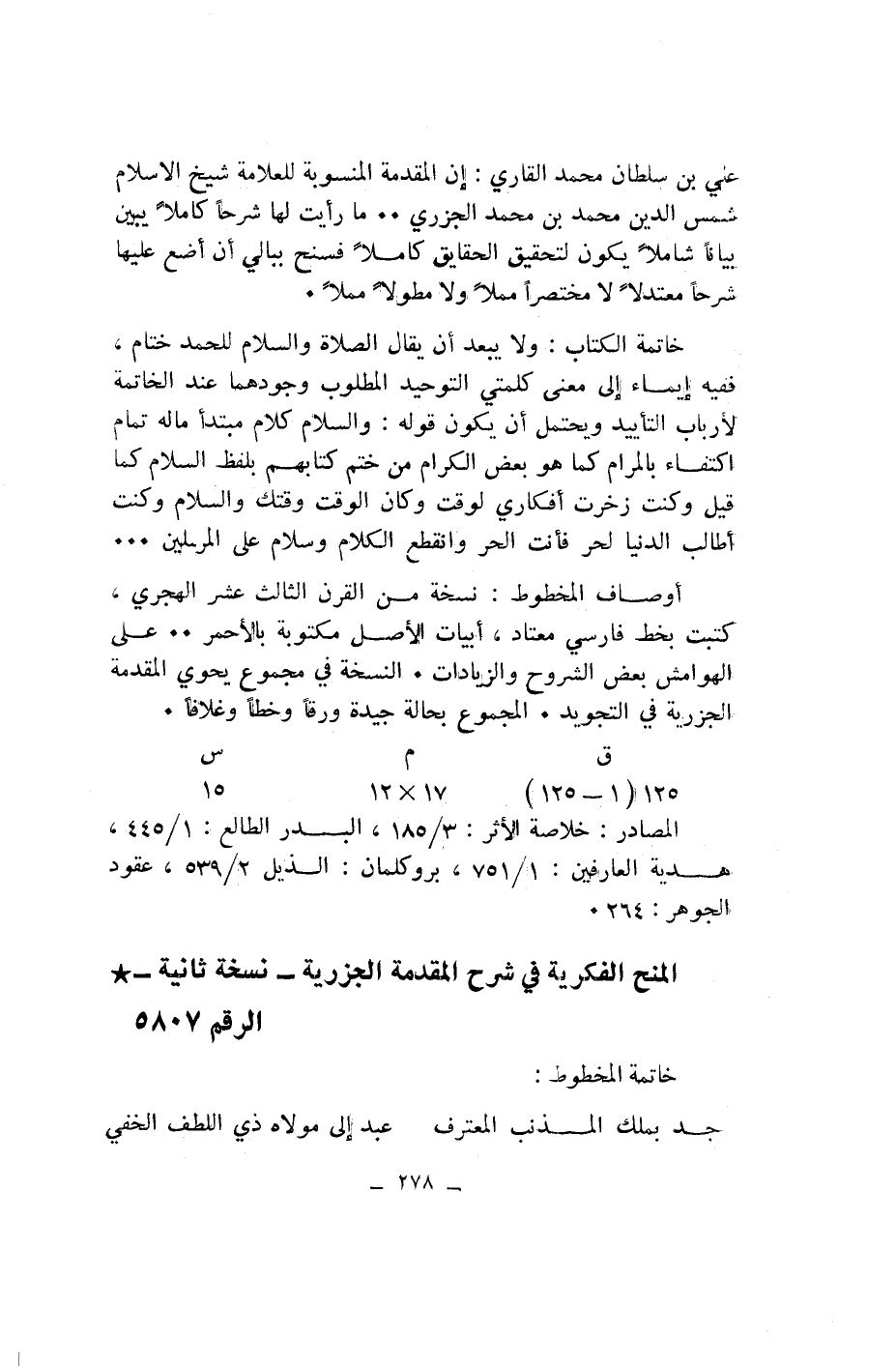 المنح الفكرية في شرح المقدمة الجزرية- نسخة ثانية-* الرقم 5807