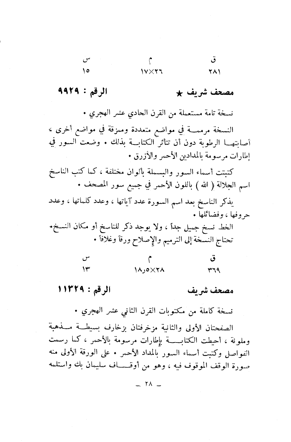 يذكر الناسخ بعد اسم السورة عدد آياتها، وعدد كلماتها، وعدد حروفها، وفضائلها.