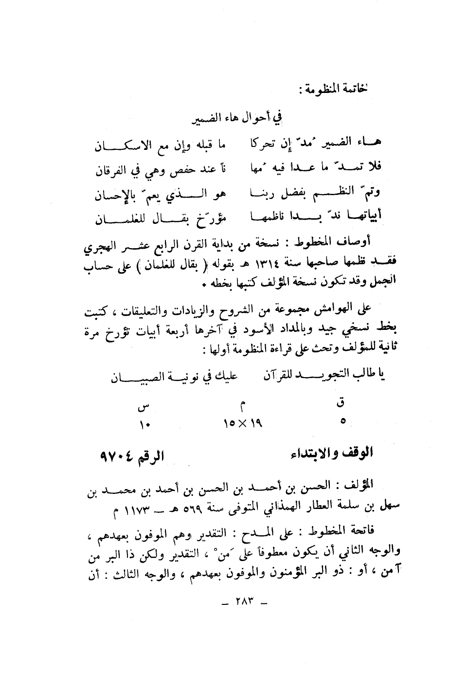 المؤلف: الحسن بن أحمد بن الحسن بن أحمد بن محمد بن سهل بن سلمة العطار الهمذاني المتوفى سنة 569 هـ- 1173 م فاتحة المخطوط: على المدح: التقدير وهم الموفون