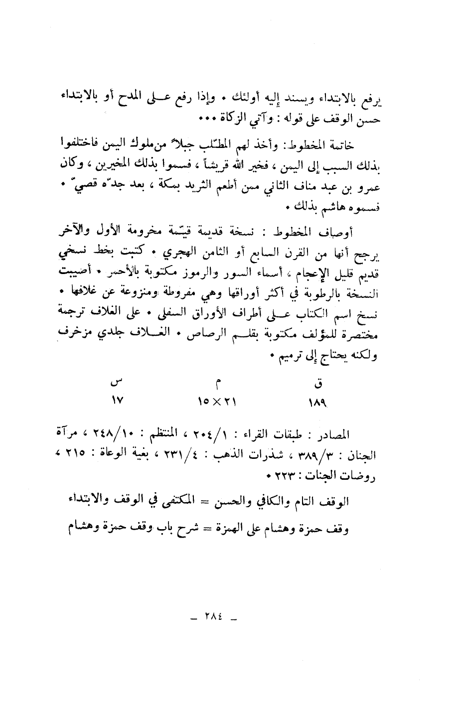 خاتمة المخطوط: وأخذ لهم المطّلب جبلا من ملوك اليمن فاختلفوا بذلك السبب إلى اليمن، فخير الله قريشا، فسموا بذلك المخيرين، وكان عمرو بن عبد مناف الثاني ممن أطعم الثريد بمكة، بعد جدّه قصيّ.