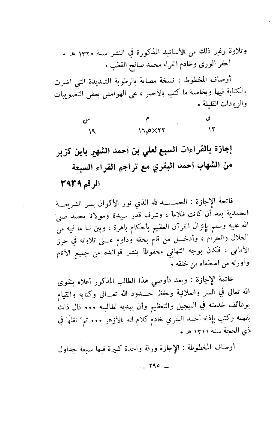 إجازة بالقراءات السبع لعلي بن أحمد الشهير بابن كزبر من الشهاب أحمد البقري مع تراجم القراء السبعة الرقم 3939