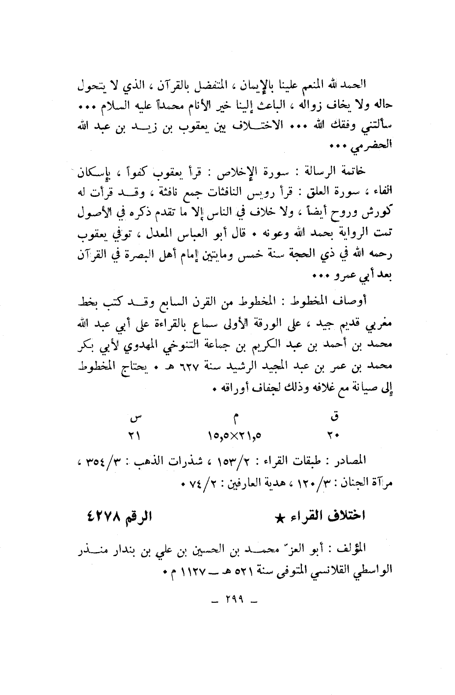 خاتمة الرسالة: سورة الإخلاص: قرأ يعقوب كفوا، بإسكان الفاء، سورة العلق: قرأ رويس النافثات جمع نافثة، وقد قرأت له كورش وروح أيضا، ولا خلاف في الناس إلا ما تقدم ذكره في الأصول تمت الرواية بحمد الله وعونه. قال أبو العباس المعدل، توفي يعقوب رحمه الله في ذي الحجة سنة خمس ومائتين إمام أهل البصرة في القرآن بعد أبي عمرو ...