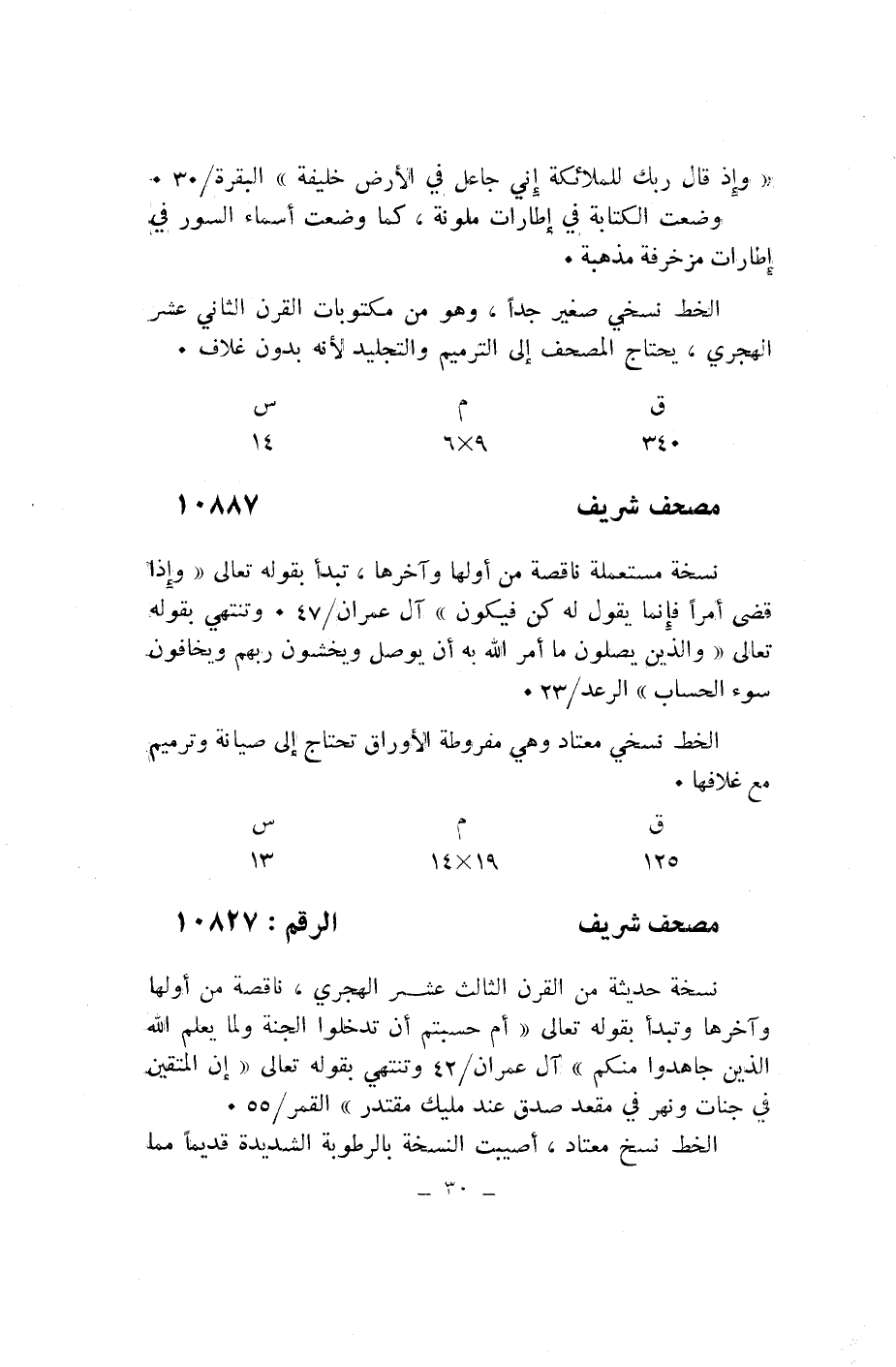 نسخة مستعملة ناقصة من أولها وآخرها، تبدأ بقوله تعالى «وَإِذا قَضى أَمْراً فَإِنَّما يَقُولُ لَهُ كُنْ فَيَكُونُ» آل عمران/ 47. وتنتهي بقوله تعالى «وَالَّذِينَ يَصِلُونَ ما أَمَرَ اللَّهُ بِهِ أَنْ يُوصَلَ وَيَخْشَوْنَ رَبَّهُمْ وَيَخافُونَ سُوءَ الْحِسابِ» الرعد/ 23.
