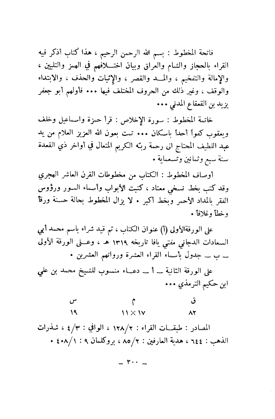 على الورقة الأولى (أ) عنوان الكتاب، ثم قيد شراء باسم محمد أبي السعادات الدجاني مفتي يافا تاريخه 1319 هـ، وعلى الورقة الأولى- ب- جدول بأسماء القراء العشرة ورواتهم العشرين.