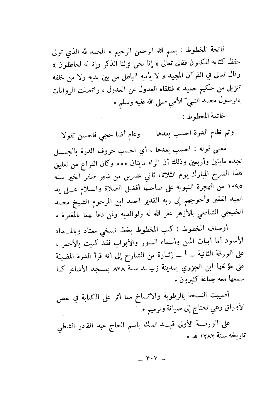 معنى قوله: احسب بعدها، أي احسب حروف الدرة بالجمل تجده مائتين وأربعين وذلك أن الراء مائتان ... وكان الفراغ من تعليق هذا الشرح المبارك يوم الثلاثاء ثاني عشرين من شهر صفر الخير سنة 1095 من الهجرة النبوية على صاحبها أفضل الصلاة والسلام على يد العبد الفقير وأحوجهم إلى ربه القدير أحمد ابن المرحوم الشيخ محمد الخليجي الشافعي بالأزهر غفر الله له ولوالديه ولمن دعا لهما بالمغفرة.