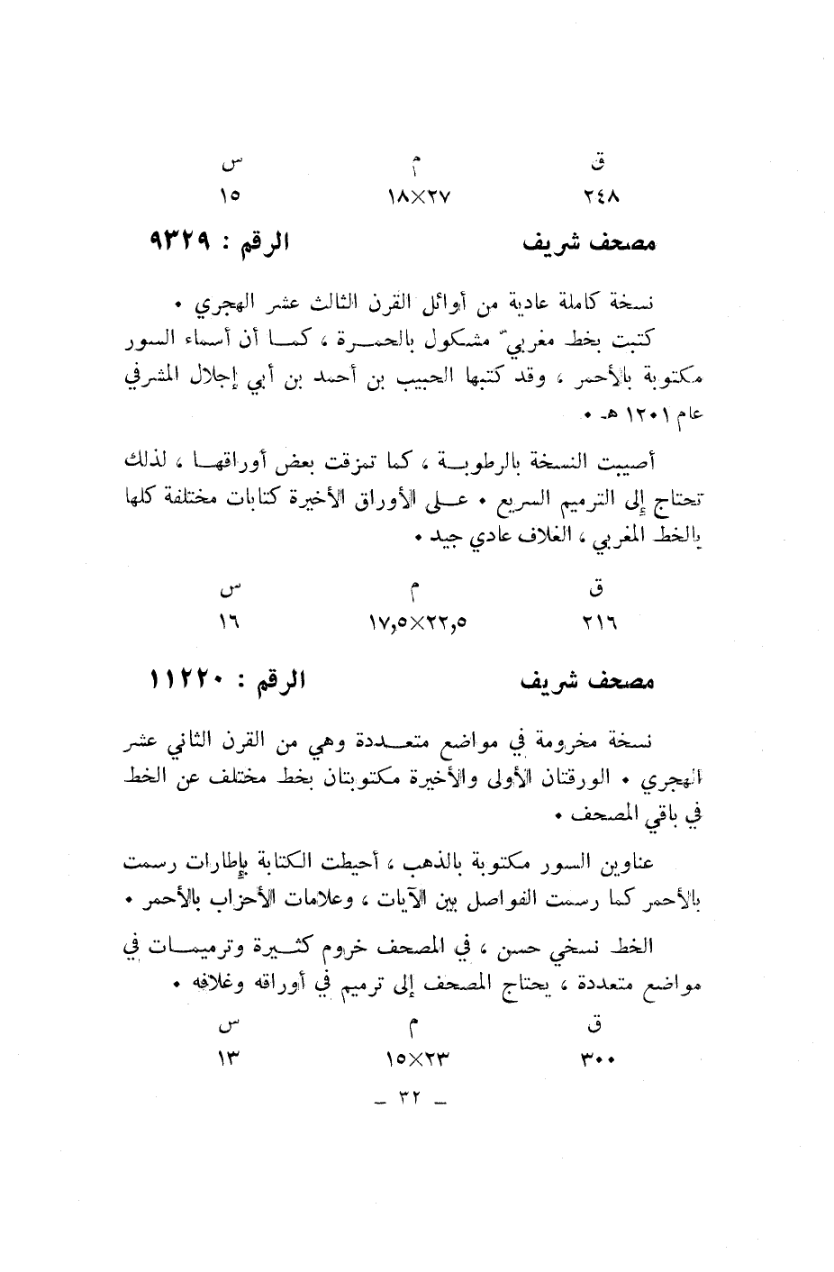 نسخة مخرومة في مواضع متعددة وهي من القرن الثاني عشر الهجري. الورقتان الأولى والأخيرة مكتوبتان بخط مختلف عن الخط في باقي المصحف.