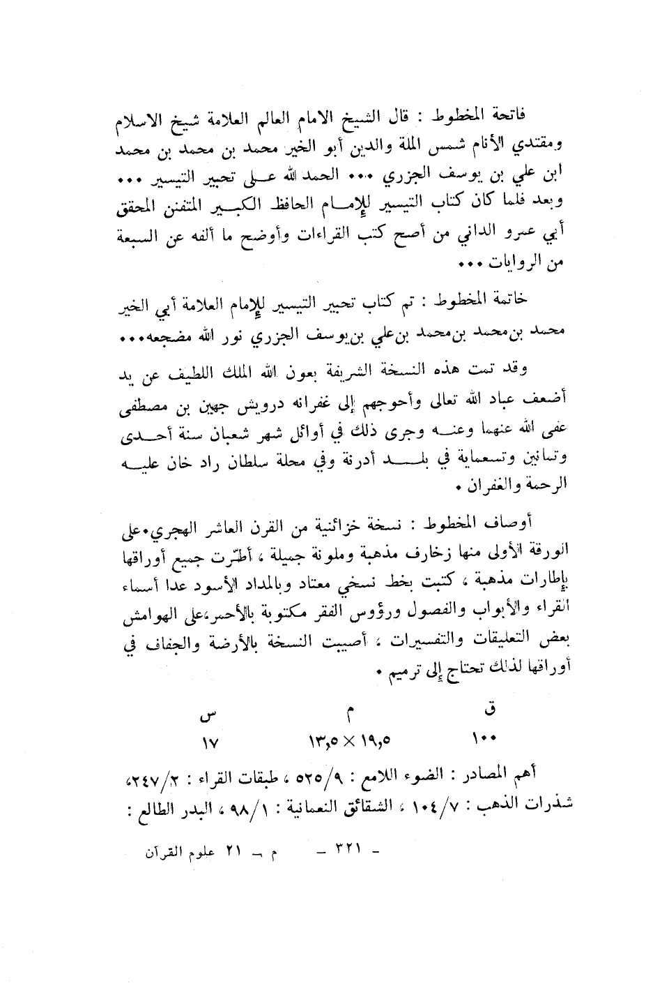 فاتحة المخطوط: قال الشيخ الامام العالم العلامة شيخ الاسلام ومقتدي الأنام شمس الملة والدين أبو الخير محمد بن محمد بن محمد ابن علي بن يوسف الجزري ... الحمد لله على تحبير التيسير ...