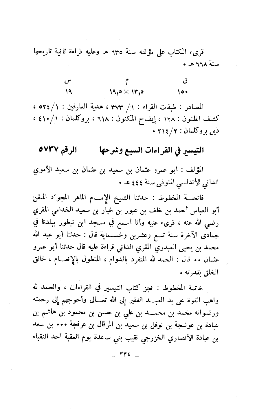 (ق 150/ م 5، 13* 5، 19/ س 19) المصادر: طبقات القراء: 1/ 373، هدية العارفين: 1/ 524، كشف الظنون: 128، إيضاح المكنون: 618، بروكلمان: 1/ 410، ذيل بروكلمان: 2/ 214.