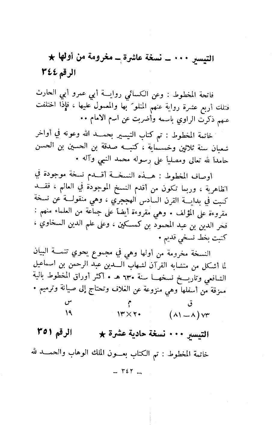 التيسير ... - نسخة عاشرة- مخرومة من أولها* الرقم 344