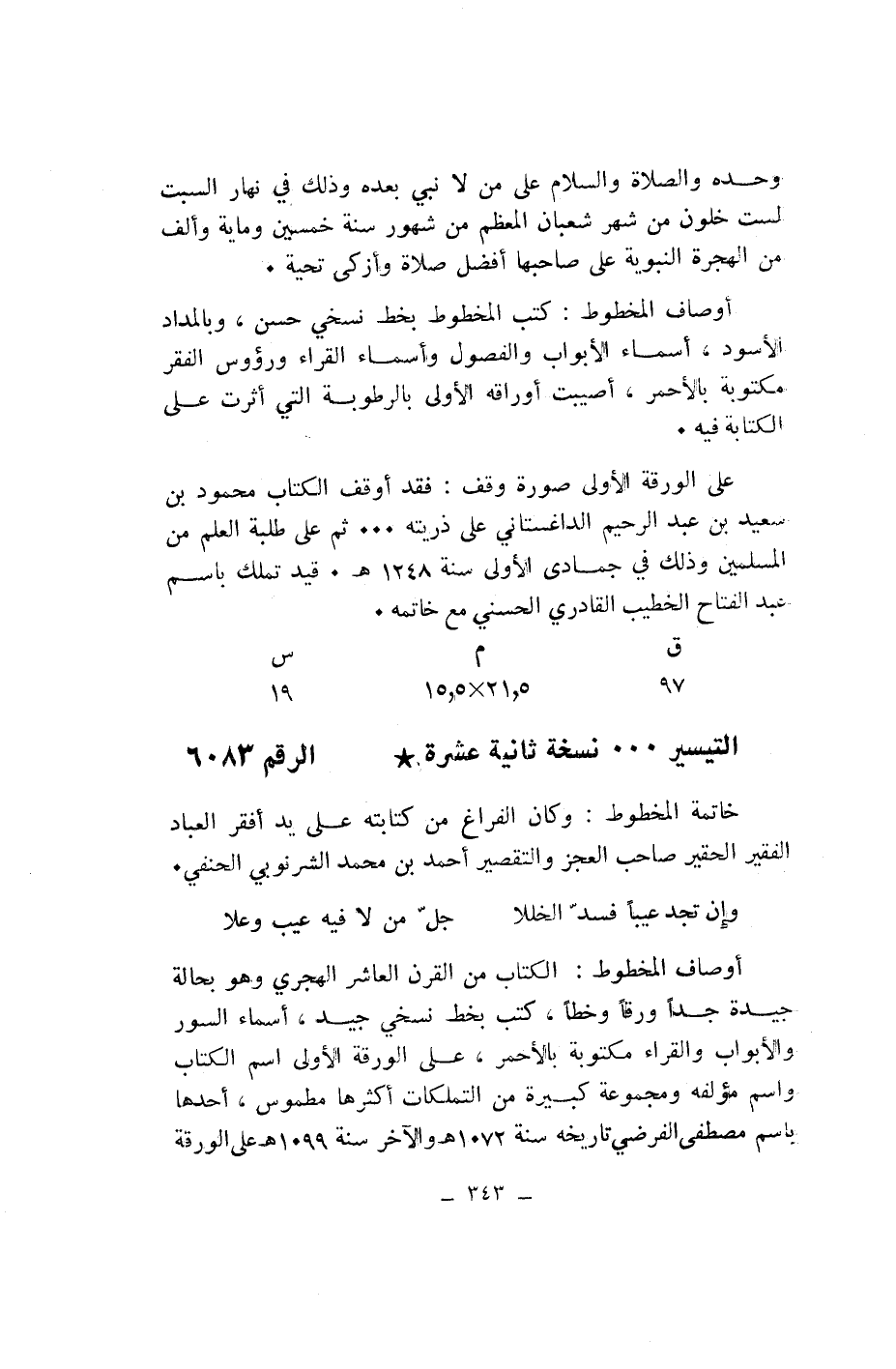 أوصاف المخطوط: الكتاب من القرن العاشر الهجري وهو بحالة جيدة جدا ورقا وخطا، كتب بخط نسخي جيد، أسماء السور والأبواب والقراء مكتوبة بالأحمر، على الورقة الأولى اسم الكتاب واسم مؤلفه ومجموعة كبيرة من التملكات أكثرها مطموس، أحدها باسم مصطفى الفرضي تاريخه سنة 1072 هـ والآخر سنة 1099 هـ على