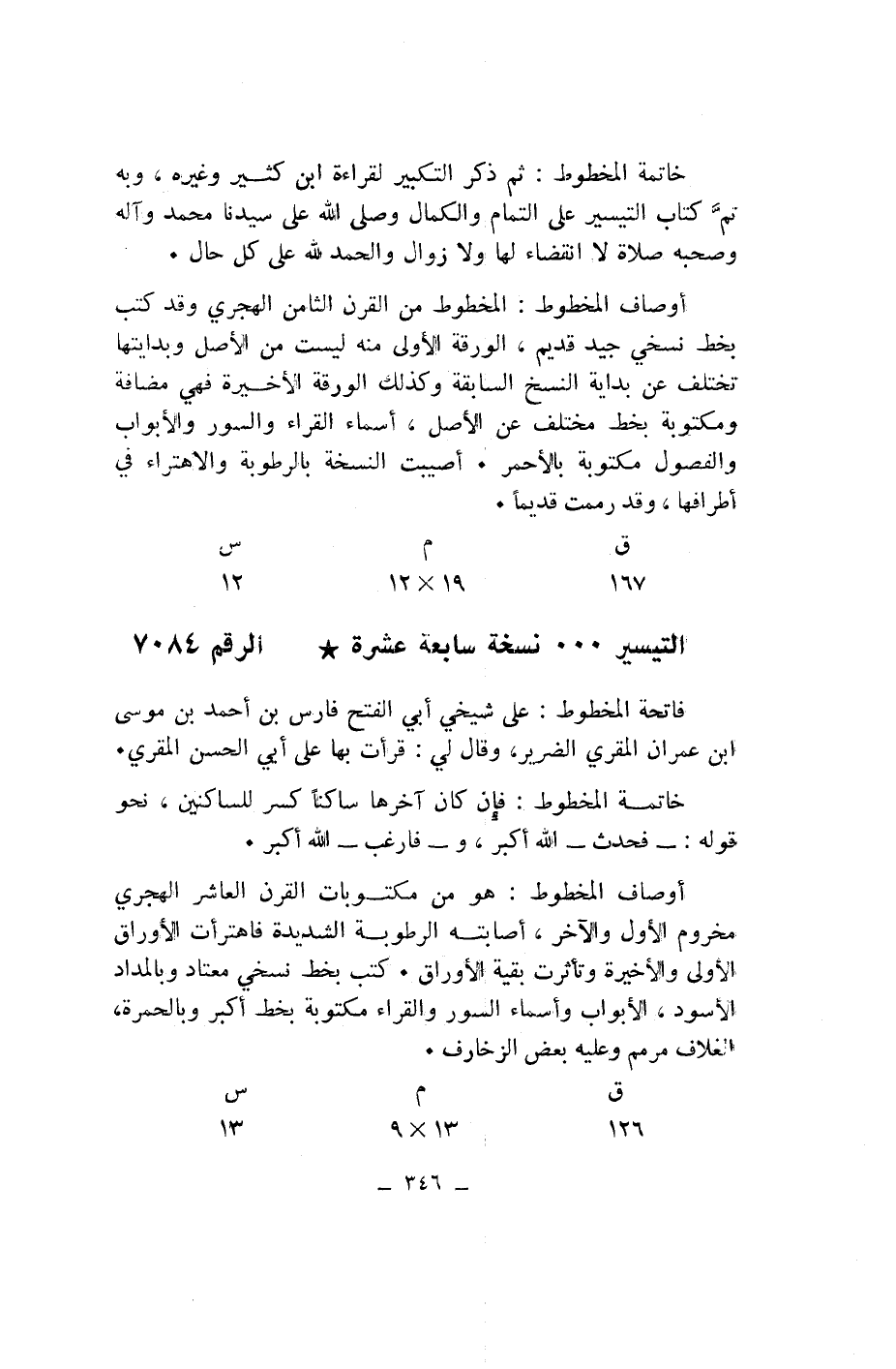 خاتمة المخطوط: ثم ذكر التكبير لقراءة ابن كثير وغيره، وبه تمّ كتاب التيسير على التمام والكمال وصلى الله على سيدنا محمد وآله وصحبه صلاة لا انقضاء لها ولا زوال والحمد لله على كل حال.