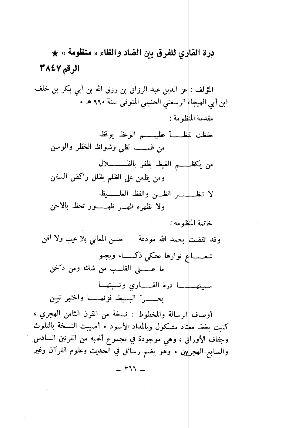 درة القاري للفرق بين الضاد والظاء «منظومة» * الرقم 3847