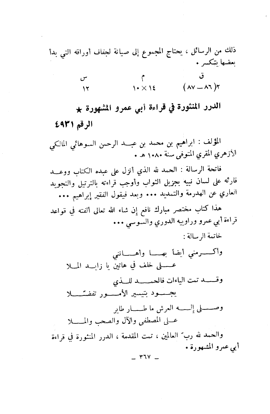 الدرر المنثورة في قراءة أبي عمرو المشهورة* الرقم 4931