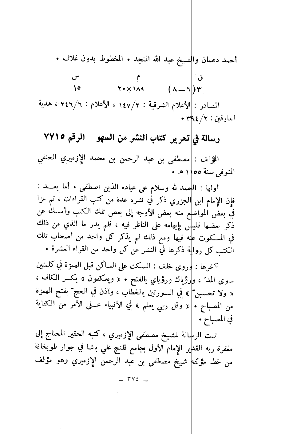 رسالة في تحرير كتاب النشر من السهو الرقم 7715