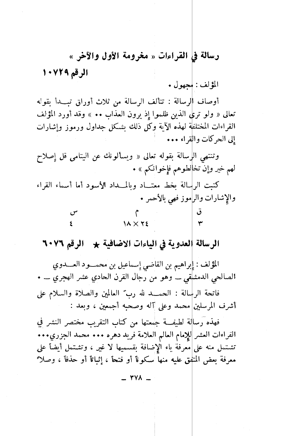 الرسالة العدوية في الياءات الاضافية* الرقم 6076