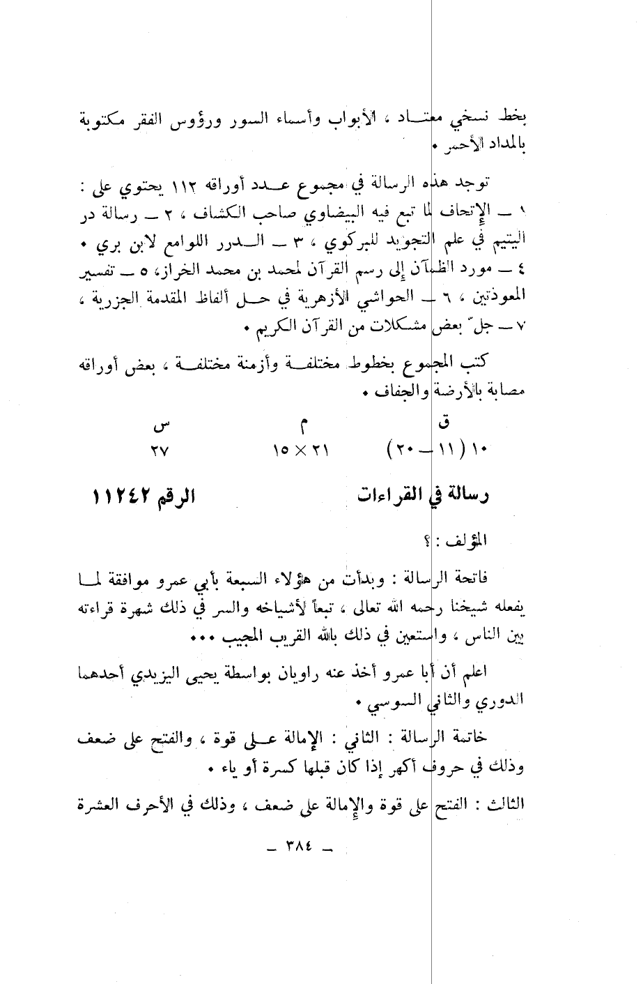 فاتحة الرسالة: وبدأت من هؤلاء السبعة بأبي عمرو موافقة لما يفعله شيخنا رحمه الله تعالى، تبعا لأشياخه والسر في ذلك شهرة قراءته بين الناس، واستعين في ذلك بالله القريب المجيب ...