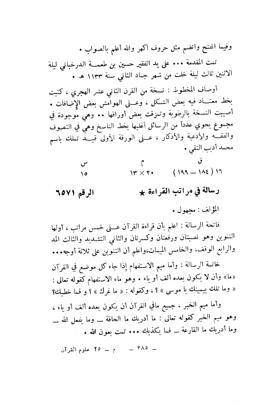 فاتحة الرسالة: اعلم بأن قراءة القرآن على خمس مراتب، أولها التنوين وهو نصبتان ورفعتان وكسرتان والثاني التشديد والثالث المد والرابع الوقف، والخامس الميمات، واعلم أن التنوين على ثلاثة أوجه ...