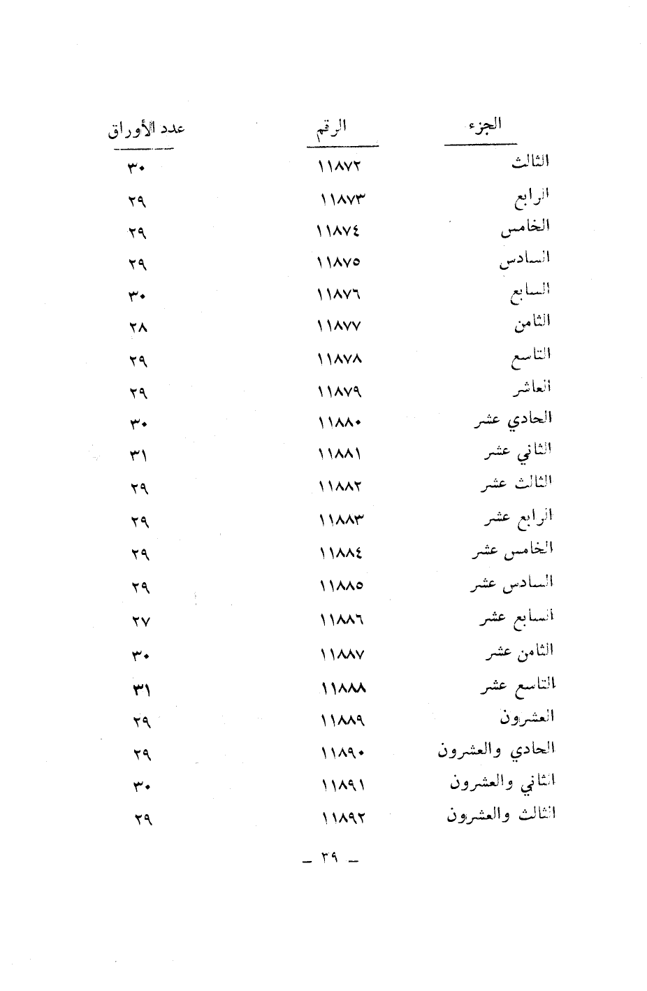 الجزء/ الرقم/ عدد الأوراق الثالث/ 11872/ 30 الرابع/ 11873/ 29 الخامس/ 11874/ 29 السادس/ 11875/ 29 السابع/ 11876/ 30 الثامن/ 11877/ 28 التاسع/ 11878/ 29 العاشر/ 11879/ 29 الحادي عشر/ 11880/ 30 الثاني عشر/ 11881/ 31 الثالث عشر/ 11882/ 29 الرابع عشر/ 11883/ 29 الخامس عشر/ 11884/ 29 السادس عشر/ 11885/ 29 السابع عشر/ 11886/ 27 الثامن عشر/ 11887/ 30 التاسع عشر/ 11888/ 31 العشرون/ 11889/ 29 الحادي والعشرون/ 11890/ 29 الثاني والعشرون/ 11891/ 30 الثالث والعشرون/ 11892/ 29