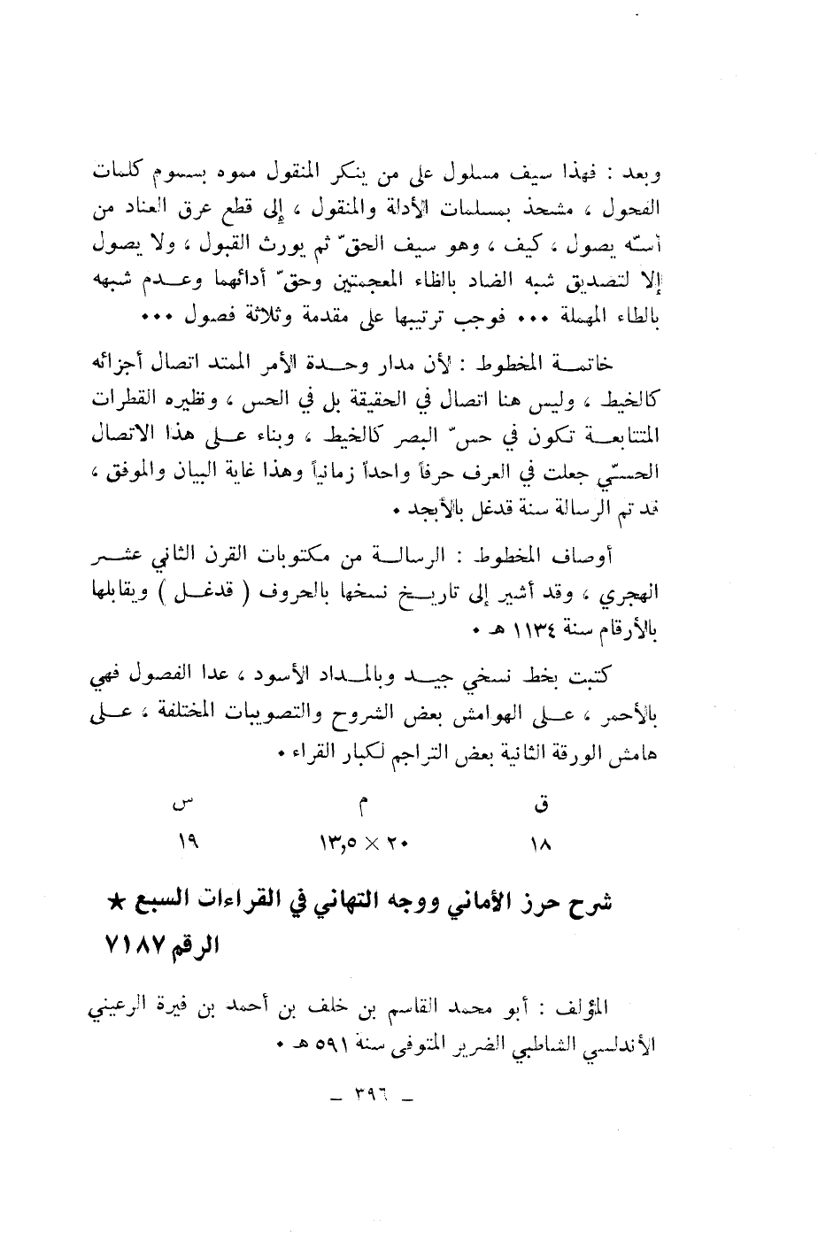 المؤلف: أبو محمد القاسم بن خلف بن أحمد بن فيرة الرعيني الأندلسي الشاطبي الضرير المتوفى سنة 591 هـ.