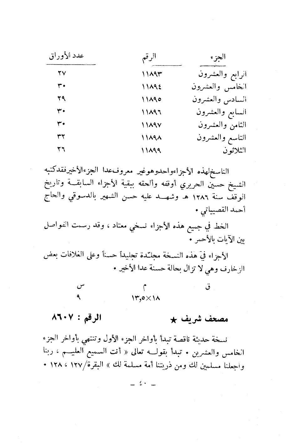 الجزء/ الرقم/ عدد الأوراق الرابع والعشرون/ 11893/ 27 الخامس والعشرون/ 11894/ 30 السادس والعشرون/ 11895/ 29 السابع والعشرون/ 11896/ 30 الثامن والعشرون/ 11897/ 30 التاسع والعشرون/ 11898/ 32 الثلاثون/ 11899/ 26 الناسخ لهذه الأجزاء واحد وهو غير معروف عدا الجزء الأخير فقد كتبه الشيخ حسين الحريري أوقفه وألحقه ببقية الأجزاء السابقة وتاريخ الوقف سنة 1286 هـ وشهد عليه حسن الشهير بالسوقي والحاج أحمد القصيباتي.