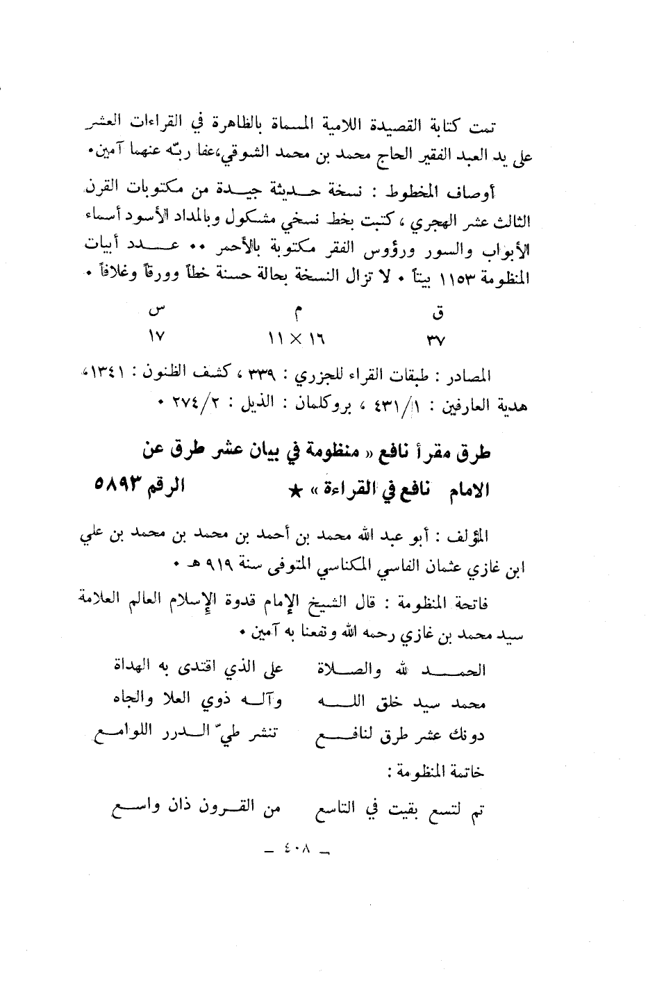 طرق مقرأ نافع «منظومة في بيان عشر طرق عن الامام نافع في القراءة» * الرقم 5893