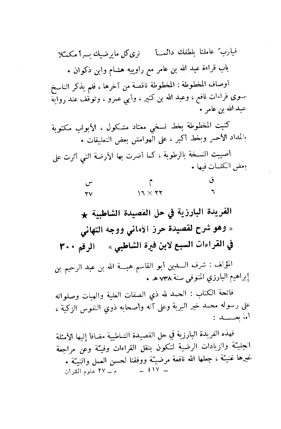 الفريدة البارزية في حل القصيدة الشاطبية* «وهو شرح لقصيدة حرز الأماني ووجه التهاني في القراءات السبع لابن فيرة الشاطبي» الرقم 300