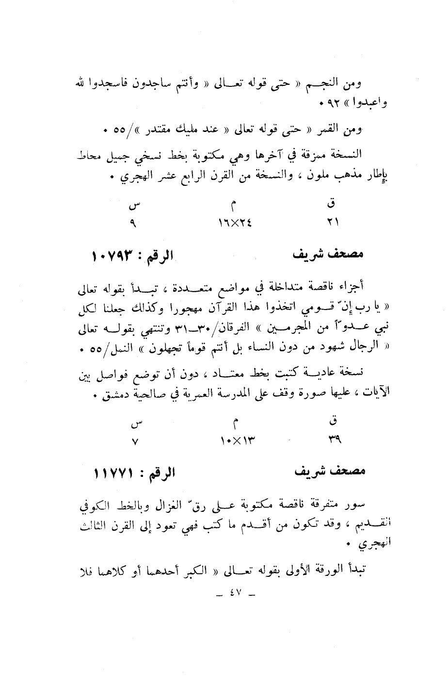 سور متفرقة ناقصة مكتوبة على رقّ الغزال وبالخط الكوفي القديم، وقد تكون من أقدم ما كتب فهي تعود إلى القرن الثالث الهجري.