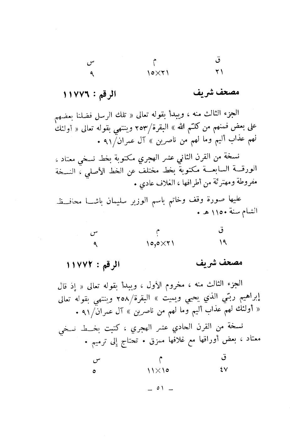 الجزء الثالث منه، مخروم الأول، ويبدأ بقوله تعالى «إِذْ قالَ إِبْراهِيمُ رَبِّيَ الَّذِي يُحْيِي وَيُمِيتُ» البقرة/ 258 وينتهي بقوله تعالى «أُولئِكَ لَهُمْ عَذابٌ أَلِيمٌ وَما لَهُمْ مِنْ ناصِرِينَ» آل عمران/ 91.