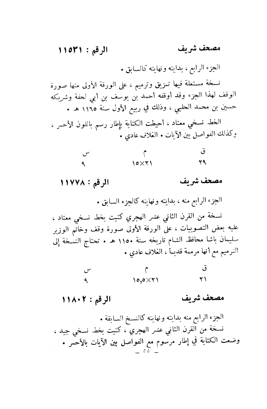 نسخة من القرن الثاني عشر الهجري، كتبت بخط نسخي جيد، وضعت الكتابة في إطار مرسوم مع الفواصل بين الآيات بالأحمر.