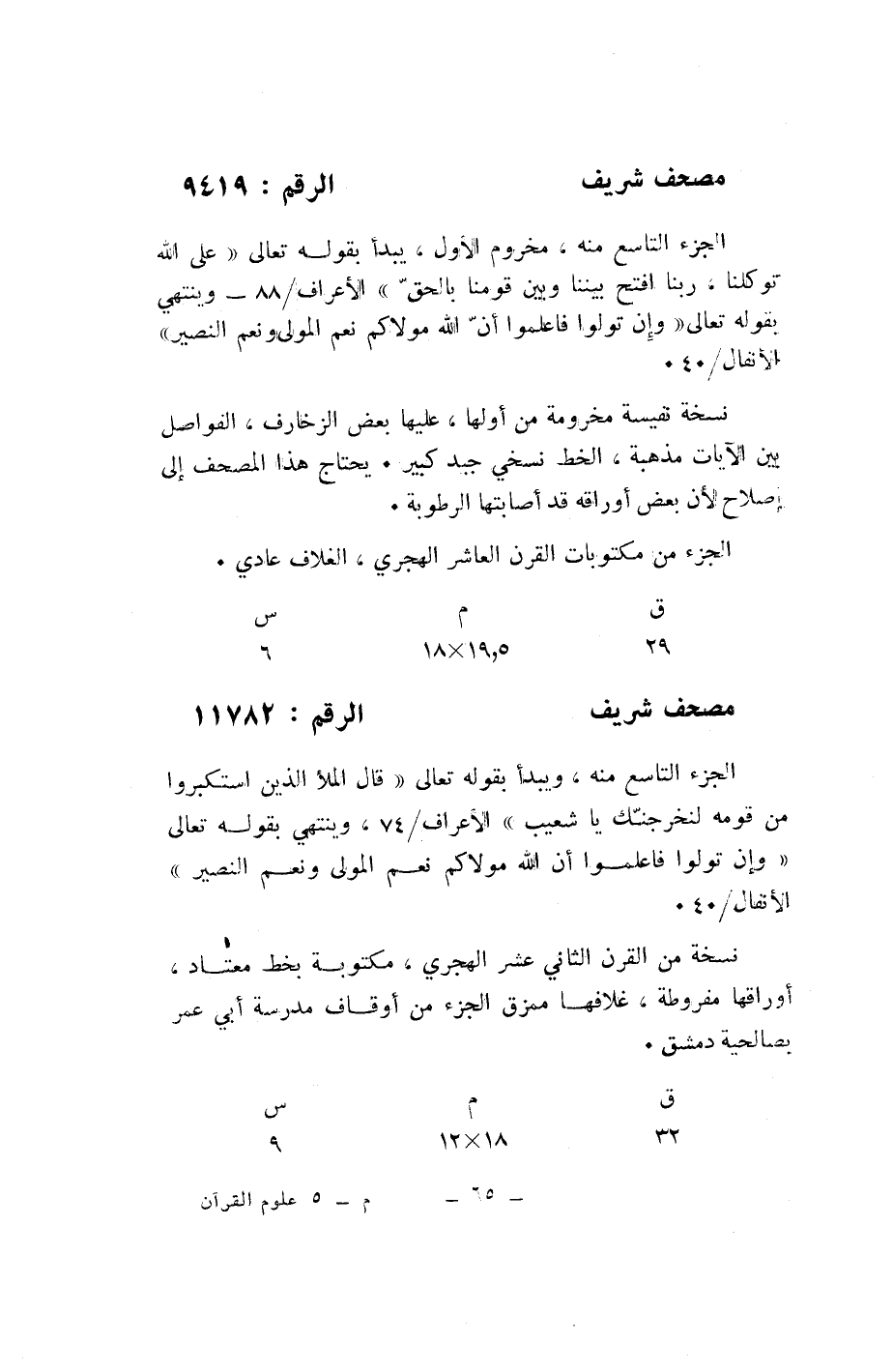 الجزء التاسع منه، مخروم الأول، يبدأ بقوله تعالى «عَلَى اللَّهِ تَوَكَّلْنا، رَبَّنَا افْتَحْ بَيْنَنا وَبَيْنَ قَوْمِنا بِالْحَقِّ» الأعراف/ 88 - وينتهي بقوله تعالى «وَإِنْ تَوَلَّوْا فَاعْلَمُوا أَنَّ اللَّهَ مَوْلاكُمْ نِعْمَ الْمَوْلى وَنِعْمَ النَّصِيرُ» الأنفال/ 40.