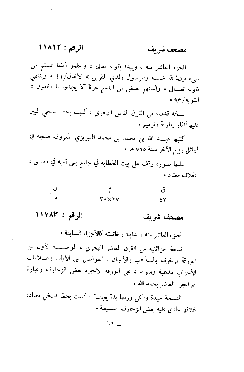 نسخة خزائنية من القرن العاشر الهجري، الوجه الأول من الورقة مزخرف بالذهب والألوان، الفواصل بين الآيات وعلامات الأحزاب مذهبة وملونة، على الورقة الأخيرة بعض الزخارف وعبارة ثم الجزء العاشر بحمد الله.