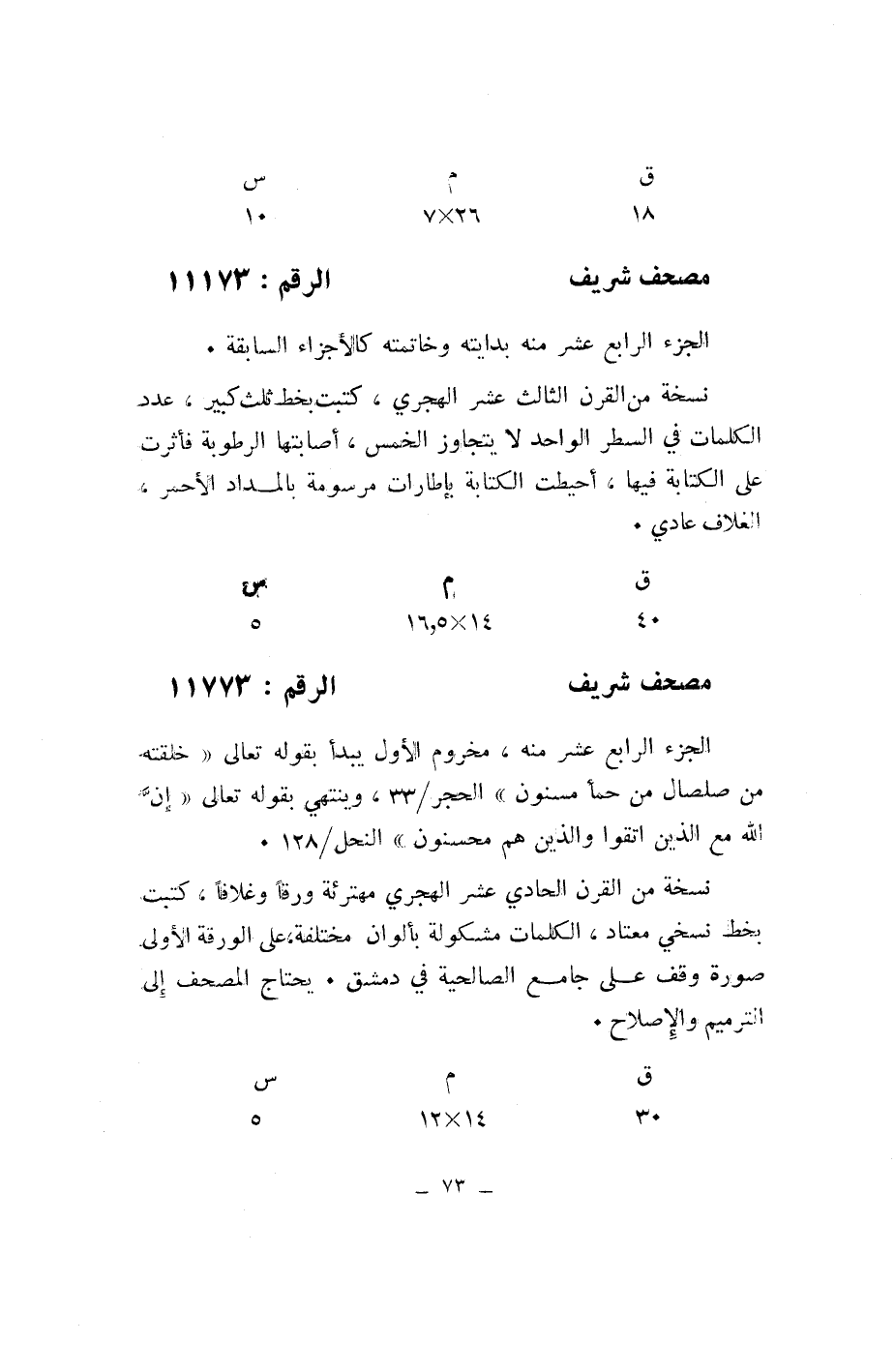 الجزء الرابع عشر منه، مخروم الأول يبدأ بقوله تعالى «خَلَقْتَهُ مِنْ صَلْصالٍ مِنْ حَمَإٍ مَسْنُونٍ» الحجر/ 33، وينتهي بقوله تعالى «إِنَّ اللَّهَ مَعَ الَّذِينَ اتَّقَوْا وَالَّذِينَ هُمْ مُحْسِنُونَ» النحل/ 128.