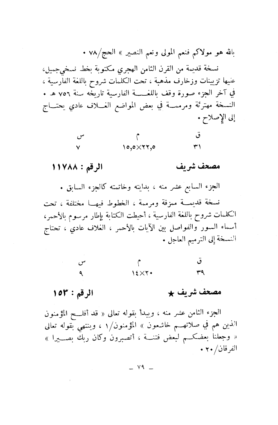 نسخة قديمة من القرن الثامن الهجري مكتوبة بخط نسخي جميل، عليها تزيينات وزخارف مذهبة، تحت الكلمات شروح باللغة الفارسية، في آخر الجزء صورة وقف باللغة الفارسية تاريخه سنة 756 هـ.
